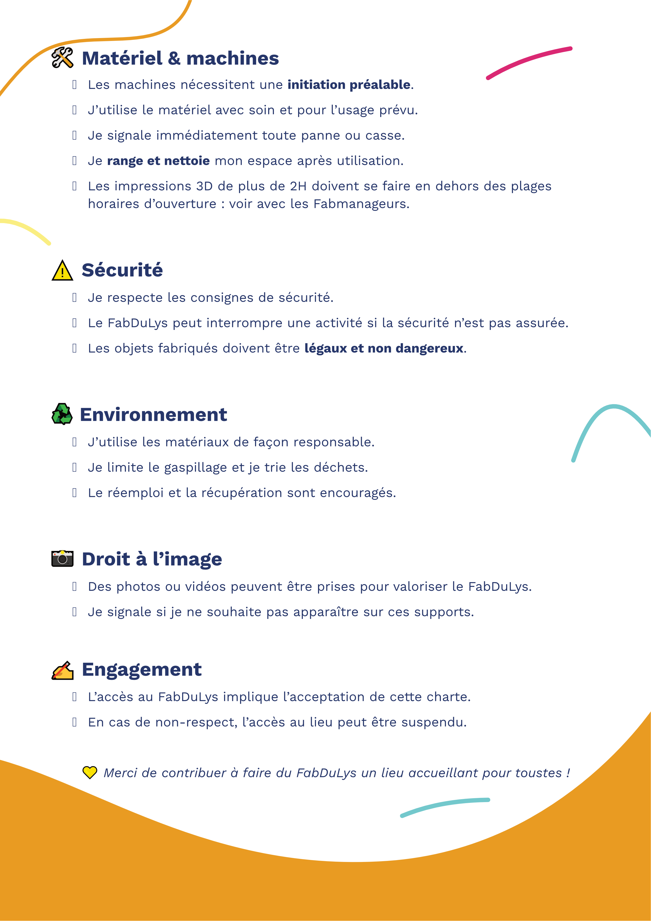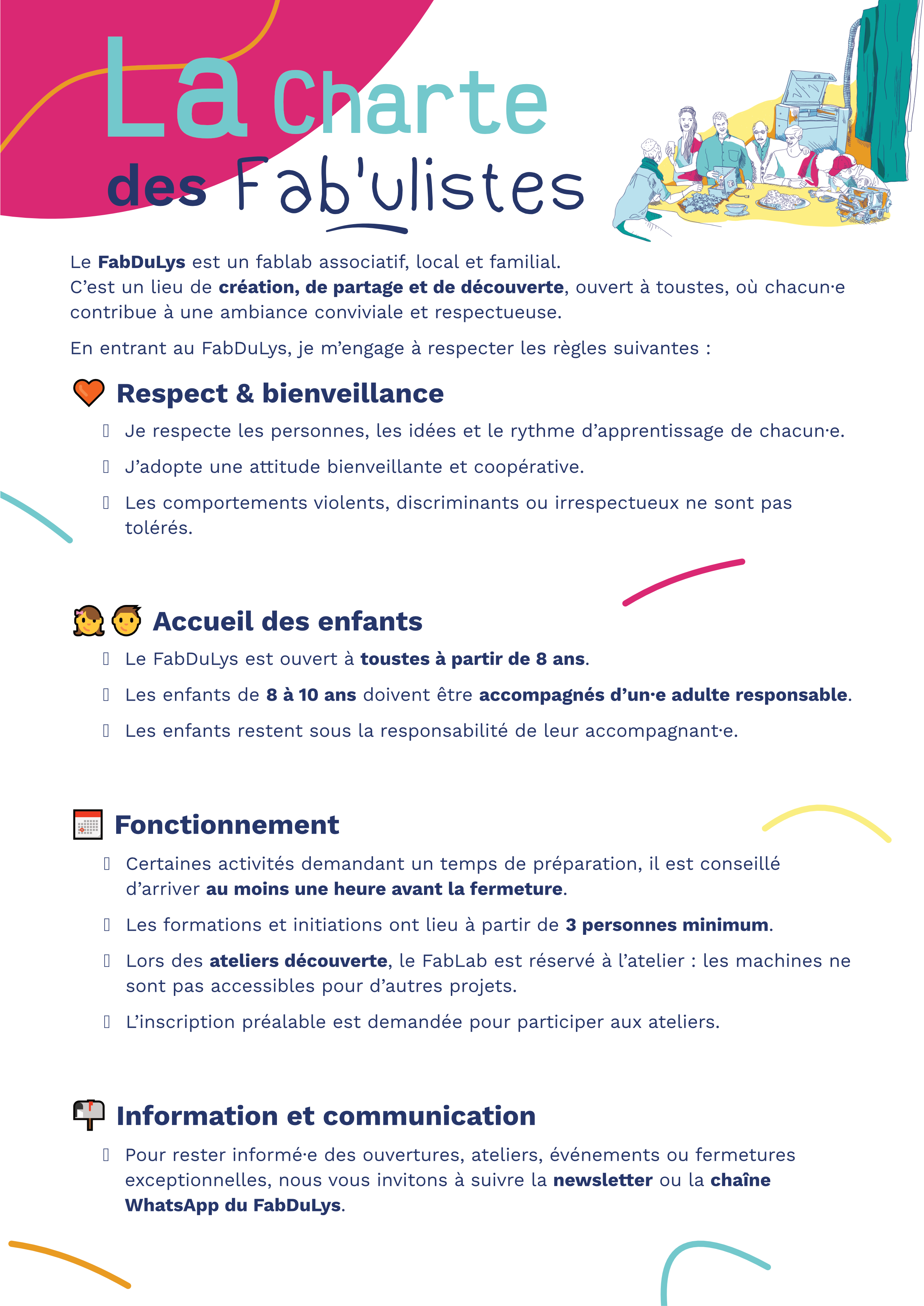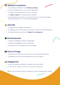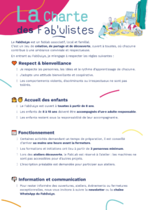 Pour que chacun puisse profiter pleinement des ateliers, des formations et des espaces de création, nous avons mis en place la charte des Fab’ulistes 📜.